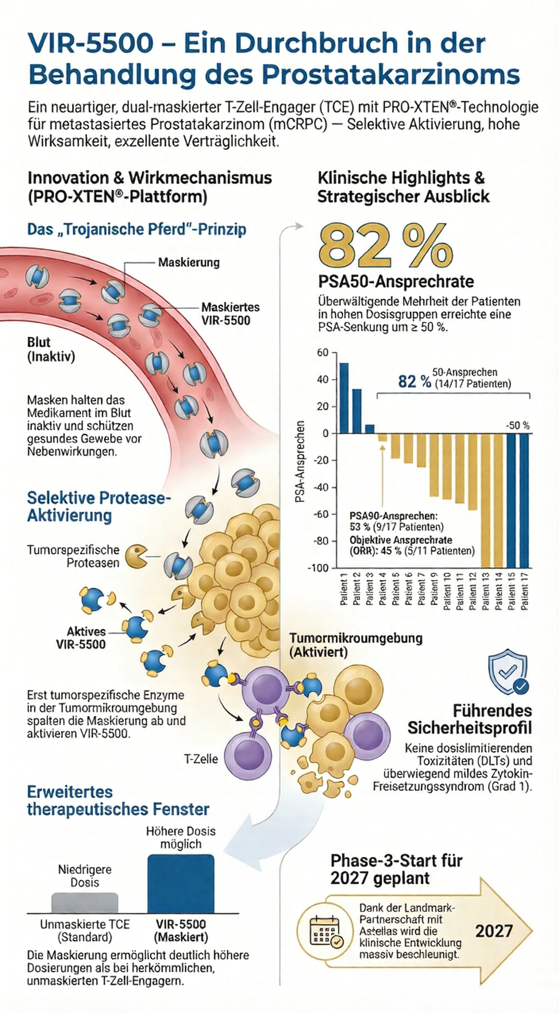 VIR-5500 ist einer der spannendsten Hoffnungsträger in der aktuellen Krebsforschung. Durch die innovative „Trojanische Pferd“-Technik bietet es die Chance auf eine hochwirksame Zerstörung von Krebszellen bei gleichzeitig besserer Verträglichkeit als frühere Immuntherapien. Besonders für Patienten, bei denen bisherige Standardbehandlungen versagt haben, zeigen die frühen Daten zu PSA-Senkungen und Tumorschrumpfungen ein Potenzial, das viele Experten als „außergewöhnlich“ bezeichnen.